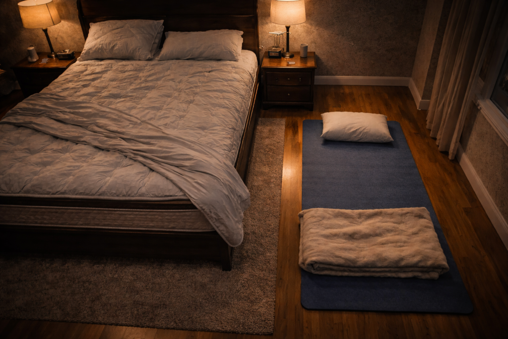I didn’t just lie down on the bare hardwood; that would have been masochism, not bio-hacking. Based on the forums I had read, I needed a transition setup. I went to the closet and dug out an old, thin yoga mat that we hadn’t used in years. I dusted it off and laid it out on the floor beside the bed. It looked pathetic. High above me, the “Cloud-Rest 5000” loomed like a fortress of comfort. My little yoga mat looked like a prison cot.
