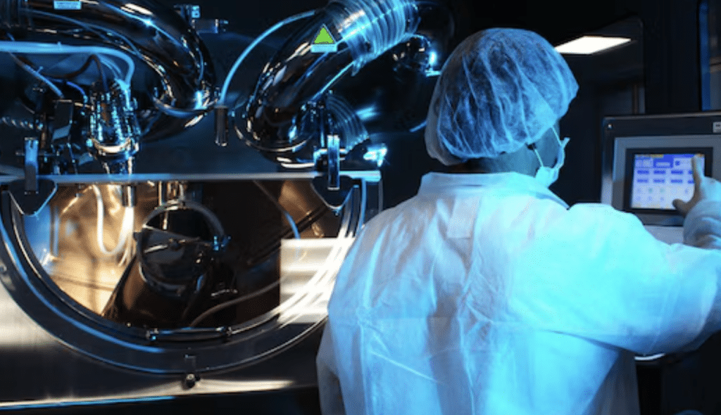 The room below was long and brightly lit, with several people moving between tables and equipment.