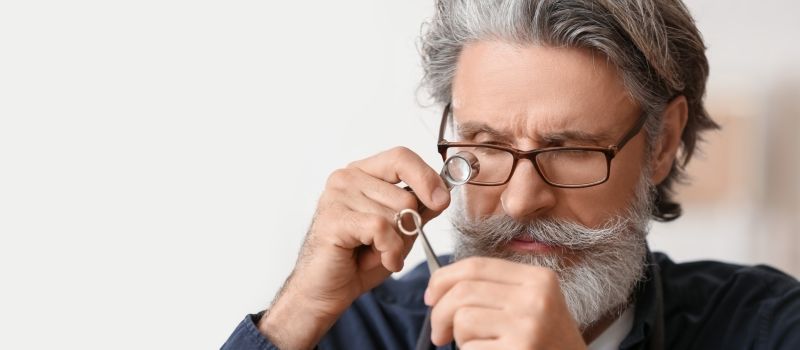 The jeweler took the ring, placing it under a bright lamp for a better view. He turned it over, examining every angle with a magnifying glass.