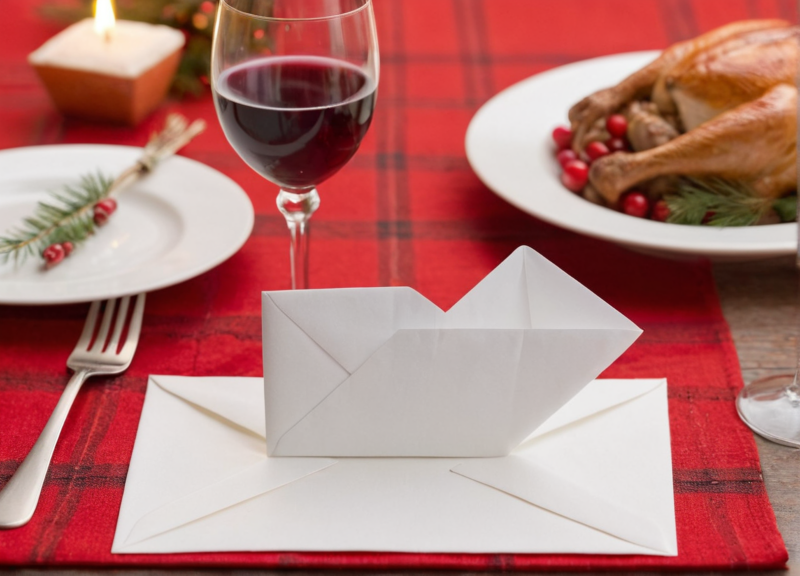 The paper made a soft hissing sound as it slid over the festive red tablecloth. It came to a stop right next to Mark’s wine glass.