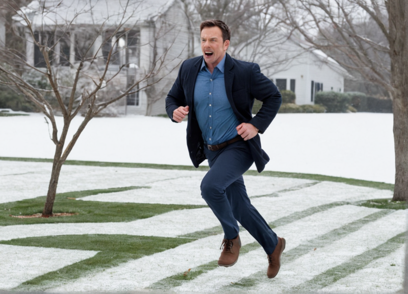 His expression shifted from confusion to panic in a split second. He abandoned his post on the porch and vaulted over the railing, landing clumsily in the snow.