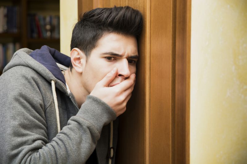 Suddenly he realized the intruder could still be inside his house. He quietly walked over to the door and put his ear against it to listen.